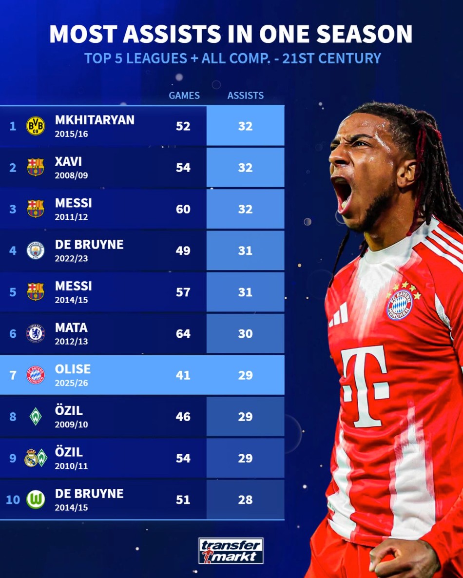 7. 奥利塞(拜仁慕尼黑)2025-26赛季 41场 29次助攻