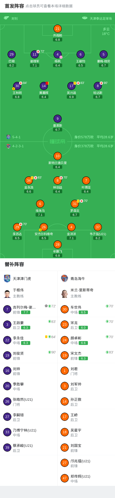 北京时间4月12日中国足球超级联赛 联赛 第5轮,天津津门虎主场对阵青岛海牛。天津津门虎吉列尔梅-谢蒂内破门,杨帆自摆乌龙。最终比分天津津门虎 1–1 青岛海牛。