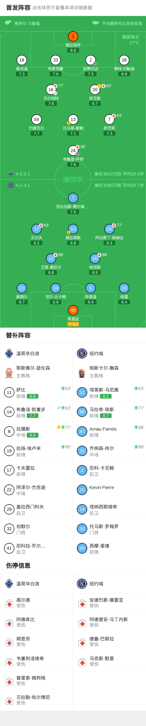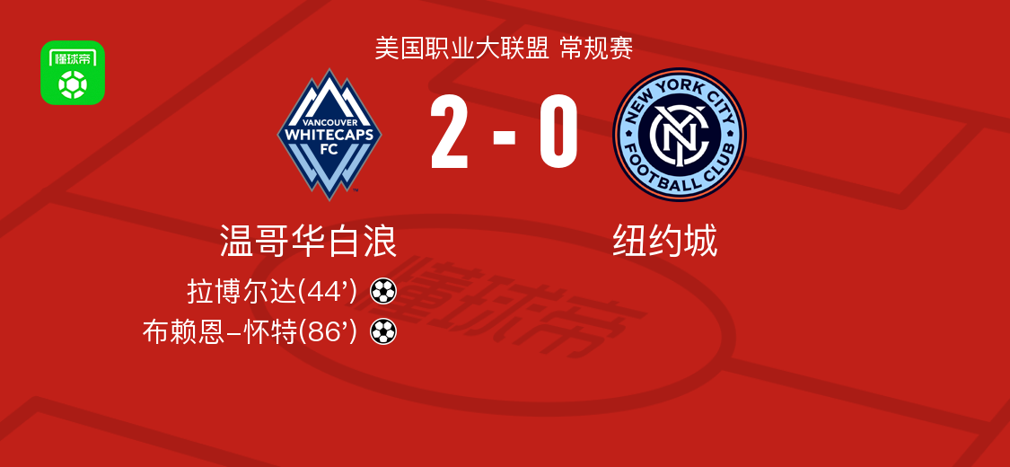 温哥华白浪2-0纽约城,拉博尔达建功,布赖恩-怀特锦上添花