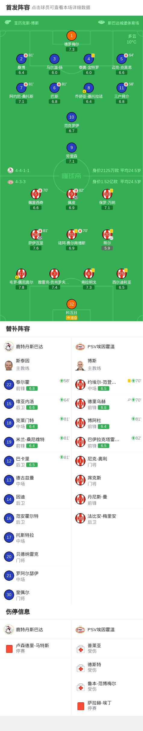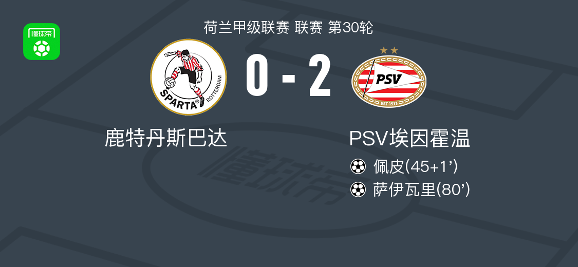 北京时间4月12日荷兰甲级联赛 联赛 第30轮,鹿特丹斯巴达主场对阵PSV埃因霍温。PSV埃因霍温佩皮破门,萨伊瓦里破门。最终比分鹿特丹斯巴达 0–2 PSV埃因霍温。