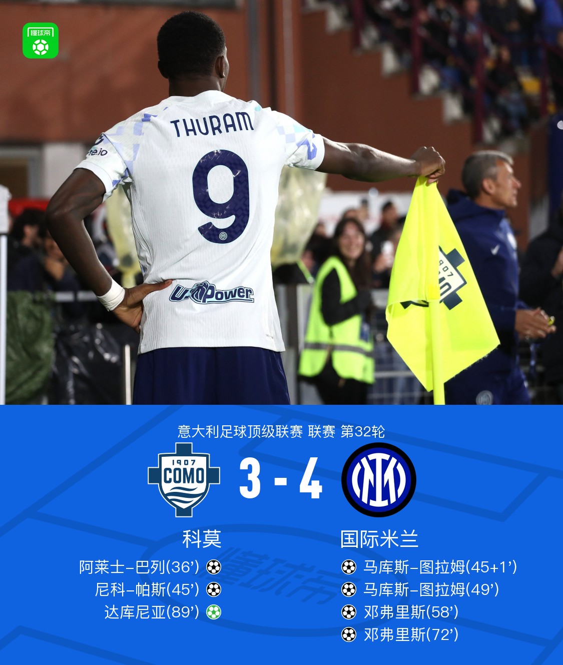 北京时间4月13日意大利足球甲级联赛第32轮,科莫主场对阵国际米兰。