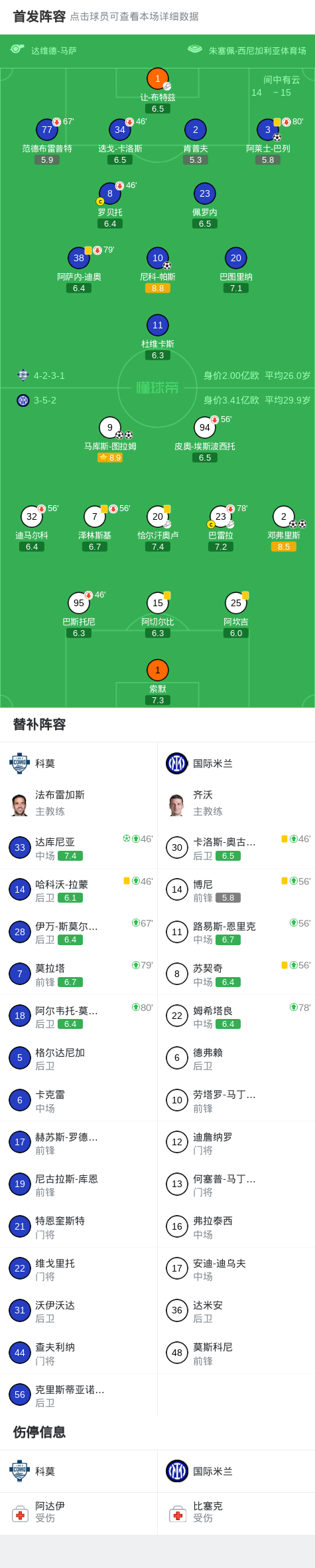 比赛中,科莫球员阿莱士-巴列率先破门,随后尼科-帕斯接队友助攻再下一城;上半场补时阶段,国际米兰球员马库斯-图拉姆接队友助攻扳回一球。