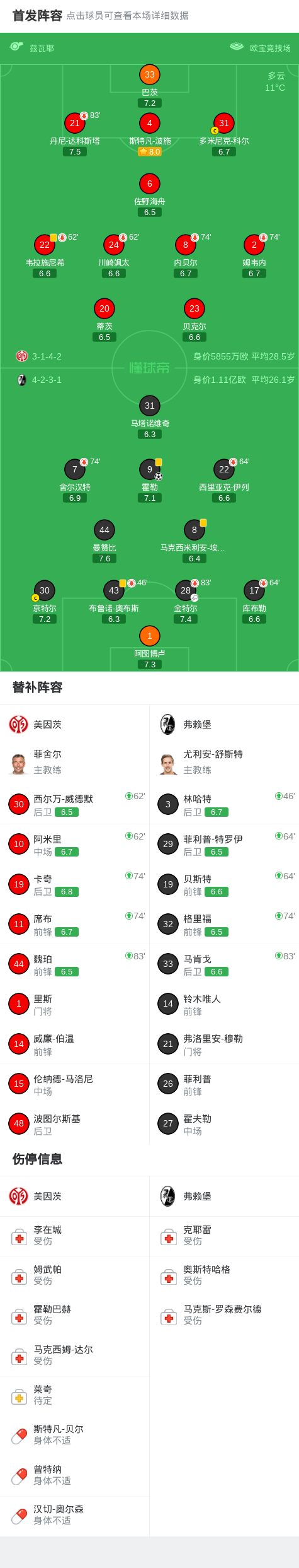 北京时间4月13日德国足球顶级联赛 联赛 第29轮,美因茨主场对阵弗赖堡。弗赖堡霍勒破门。最终比分美因茨 0–1 弗赖堡。 点击查看本场比赛详细数据>> 点击查看德甲完整积分榜>> 精彩瞬间 第47分钟,弗赖堡球员金特尔助攻霍勒打入一球。 球队阵容 技术统计 文章导航 攻破旧主大门,格伊:如果没有切尔西,我不会走到今天 半场战报:里昂0-0洛里昂