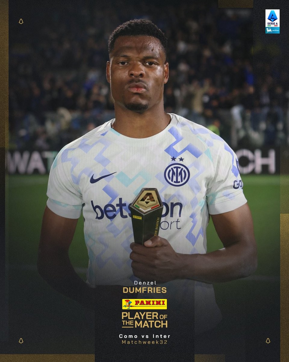 意甲第32轮,国际米兰客场4-3逆转击败科莫,此役上演梅开二度的国米后卫邓弗里斯当选意甲官方全场最佳球员。