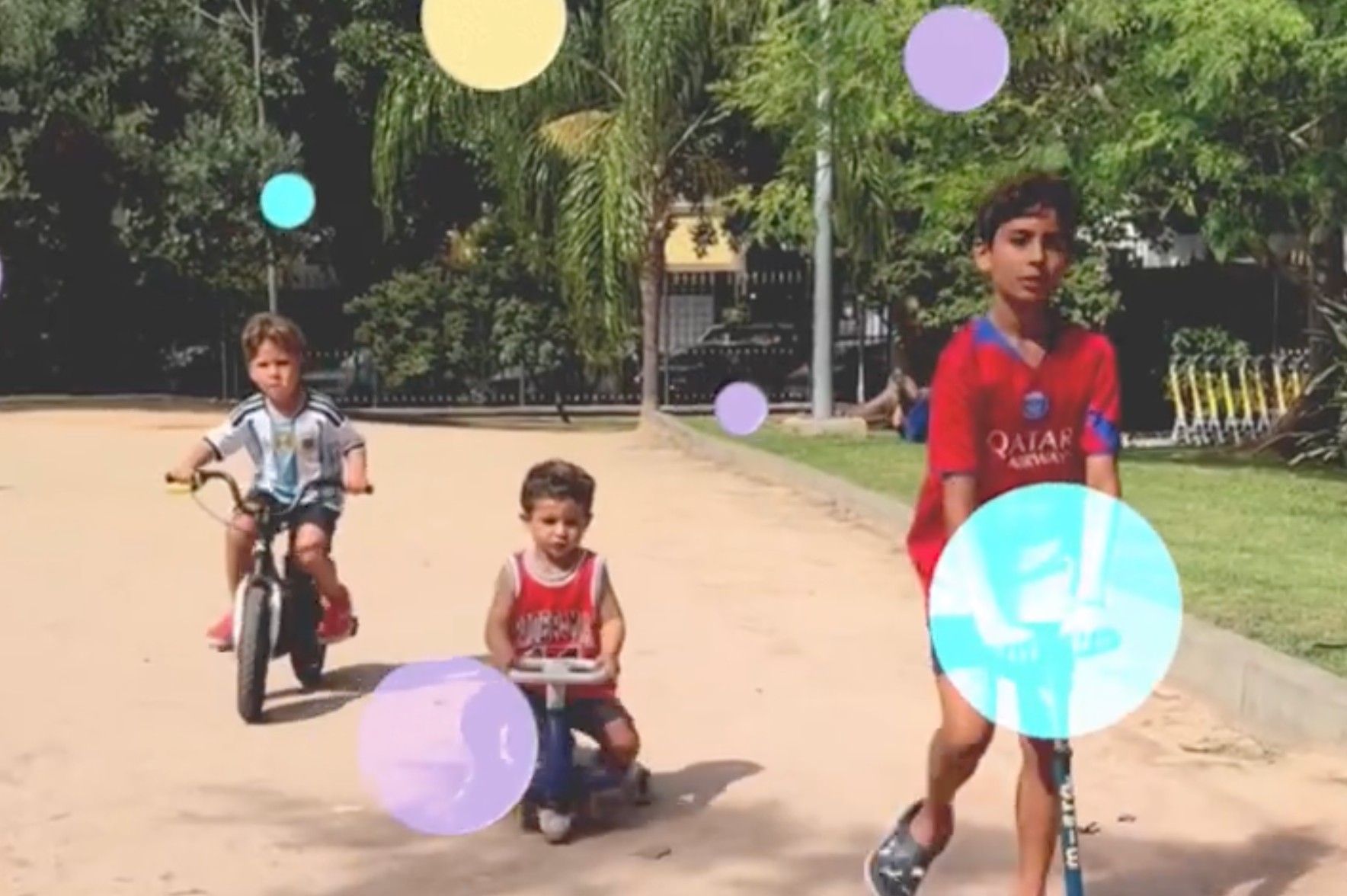 艾克森晒出了一段视频,视频里,他的三个儿子同时出镜,骑着小车,一起快乐地向前。