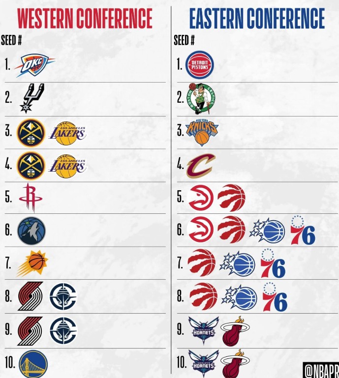 其中,西部方面雷霆、马刺、火箭、森林狼、太阳和勇士已经锁定了排名。湖人和掘金将为西部第三发起争夺,目前掘金领先一个胜场,掘金胜或两队都输球,掘金第三,掘金输球湖人赢球,湖人将凭借相互战绩优势排到第三。开拓者和快船则会为了附加赛上位区发起争夺,两队目前胜负场次相同,如果最后也是如此,则开拓者凭借更好的分区成绩排在前面。
