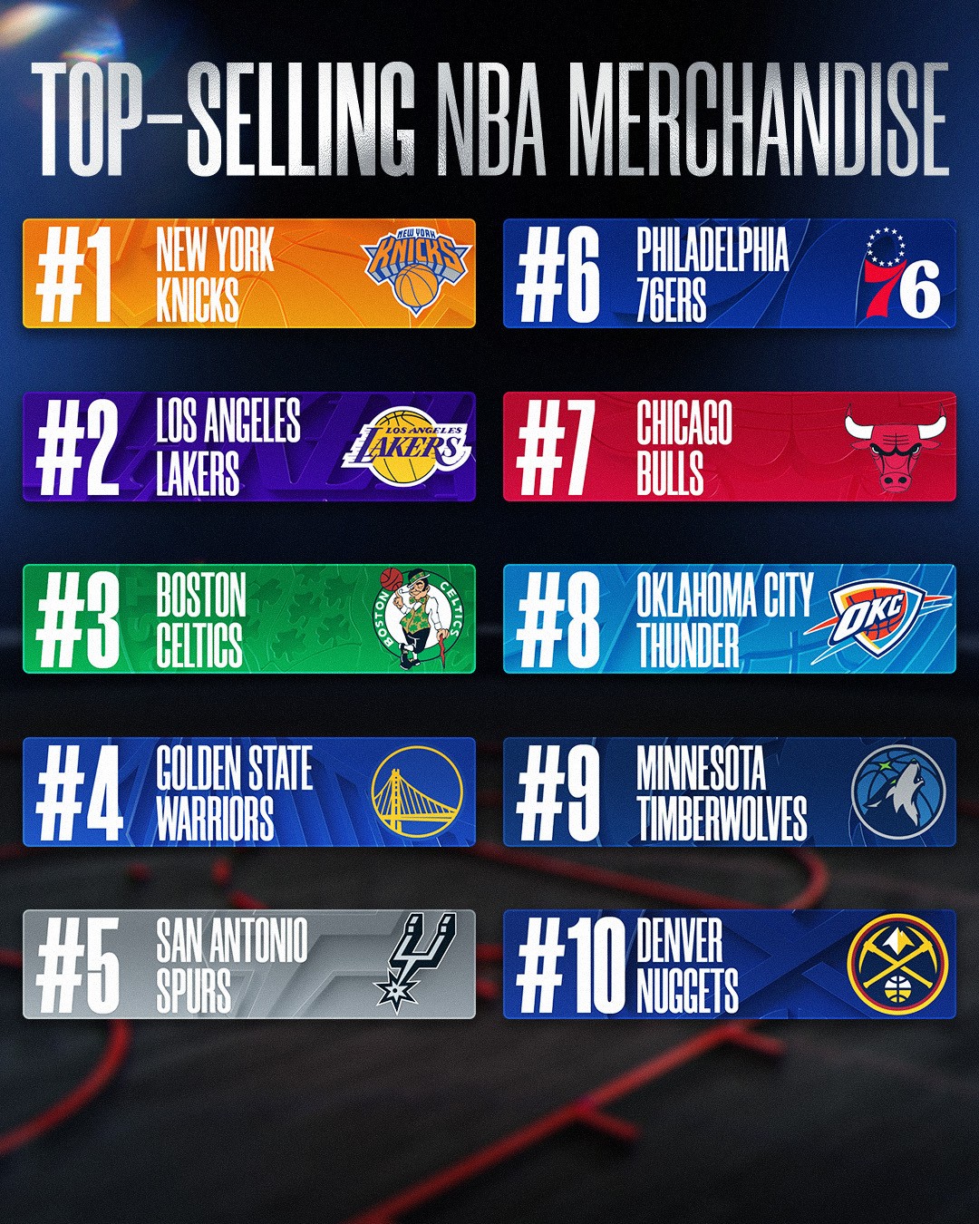 北京时间4月13日,NBA官方公布本赛季球队球衣销量排名,纽约尼克斯高居榜首。