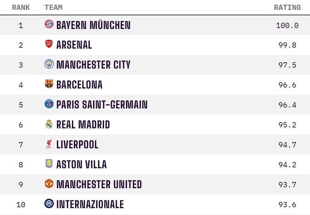 4月13日,数据平台Opta更新了本期全球俱乐部实力榜。德甲豪门拜仁位列榜首,阿森纳下降1位暂列次席,前十中英超球队共占5席,国米成为前十唯一的意甲球队。