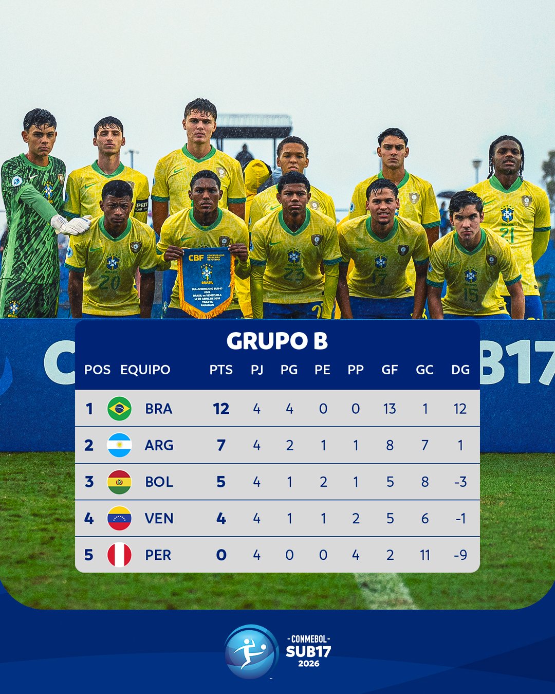 北京时间4月13日早4点,2026年南美U17锦标赛小组赛B组第五轮,巴西队1-0小胜委内瑞拉队,以全胜+小组第1的战绩晋级第二阶段争冠赛。