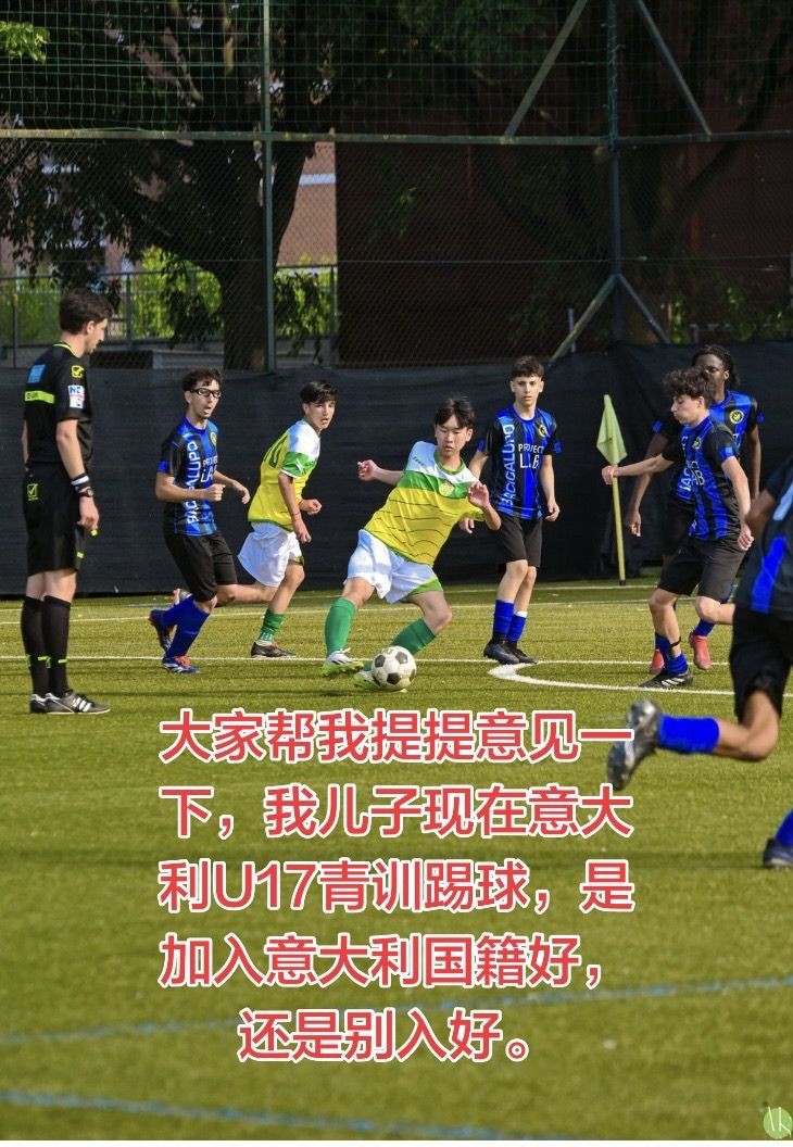 该家长写道:大家帮我提提意见,我儿子现在意大利U17青训踢球,是加入意大利国籍好,还是别入好。