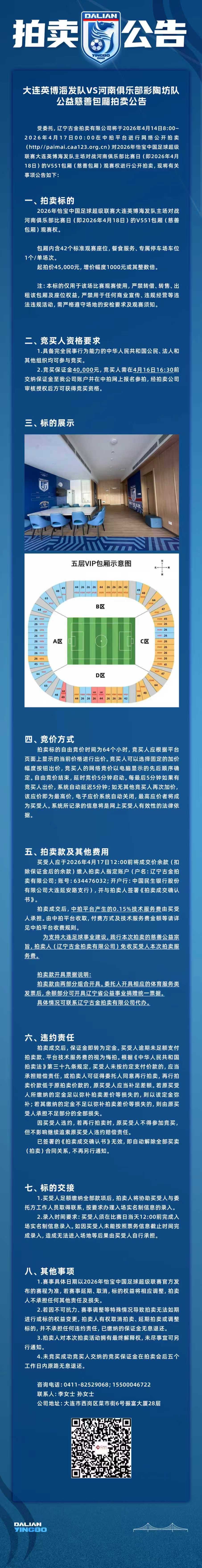 北京时间4月14日,大连英博官方发布公告,拍卖对阵河南队比赛公益慈善包厢,起拍价45000元。