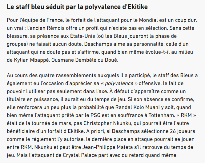 对于法国国家队来说,这位利物浦前锋无缘世界杯无疑是一大打击:埃基蒂克的特点正是目前国家队所欠缺的。如果没有这次伤病,他肯定会出现在美国(法国队将在那里参加小组赛)。德尚非常欣赏他的个性,他是一位自信而果断的前锋,即使与姆巴佩、登贝莱和杜埃并肩作战,也能保持出色的发挥。