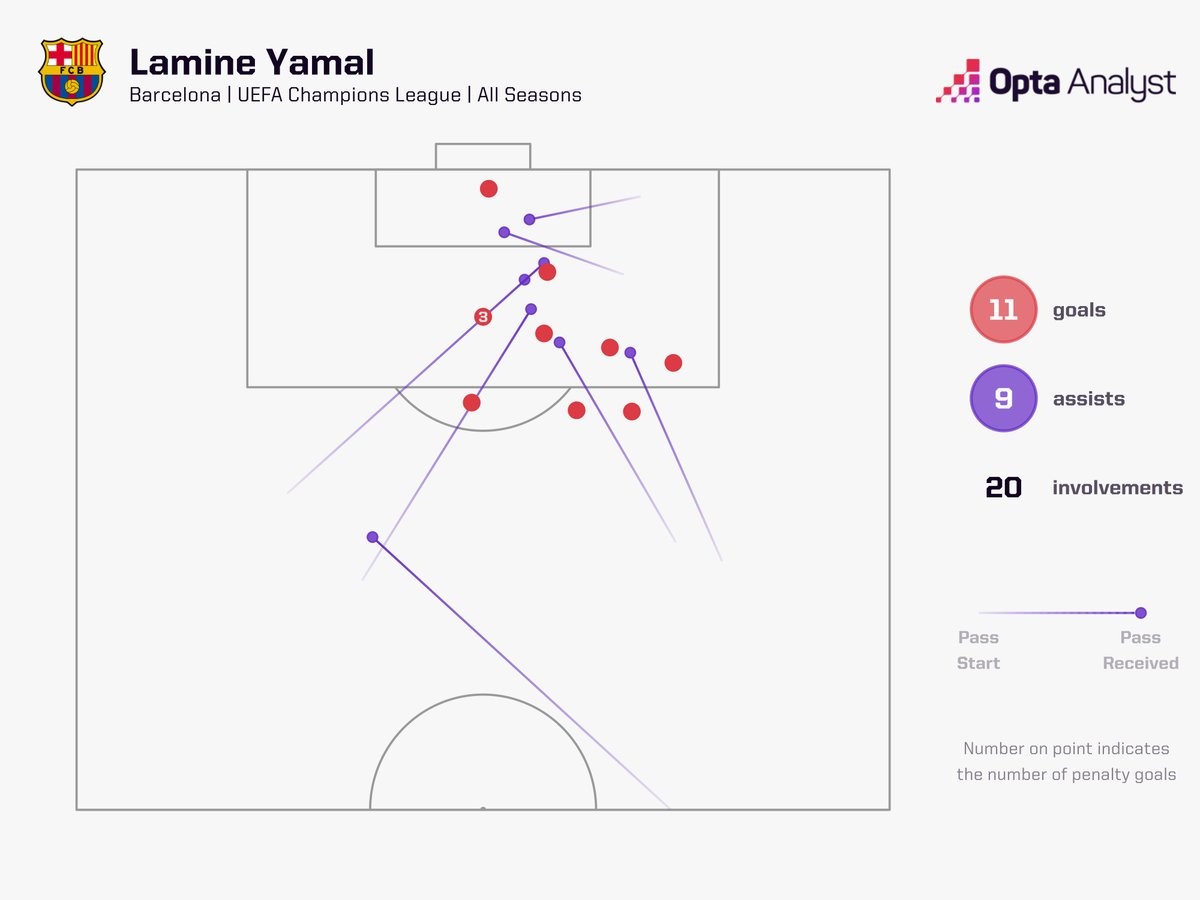 此役对阵马德里竞技打入一球后,亚马尔欧冠生涯33次出场已直接参与20球,包括11球9助。