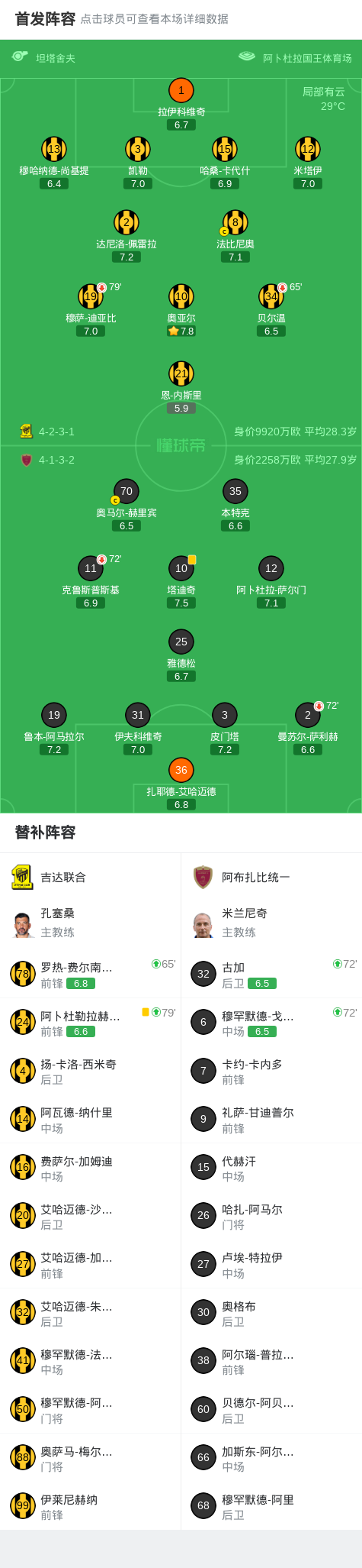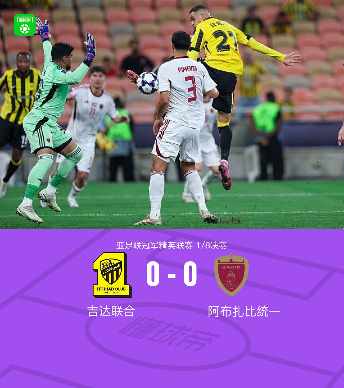 北京时间4月15日亚足联冠军精英联赛 1/8决赛,吉达联合对阵阿布扎比统一。下半场本特克进球因冲撞门将被吹。最终比分吉达联合 0–0 阿布扎比统一。