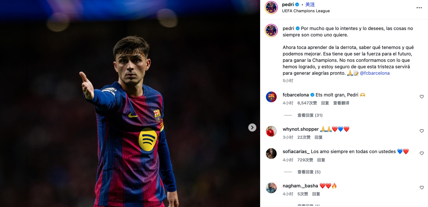 佩德里在巴萨无缘逆转淘汰马德里竞技后发布社媒表示,球队必须把这次失利转化为未来继续前进的动力。他强调,巴萨不会满足于现有成绩,目标依然是在未来几年冲击欧冠冠军。