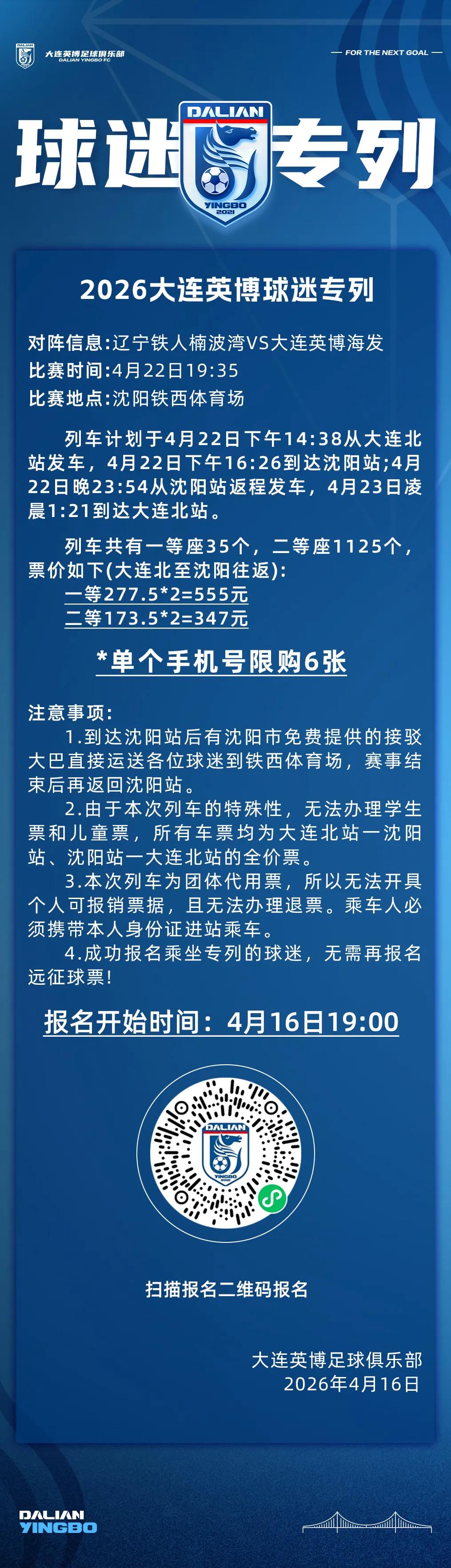 北京时间4月16日,大连英博官方消息,俱乐部为4月22日赴沈阳观战辽宁德比的球迷开通球迷专列,共1160个座位。