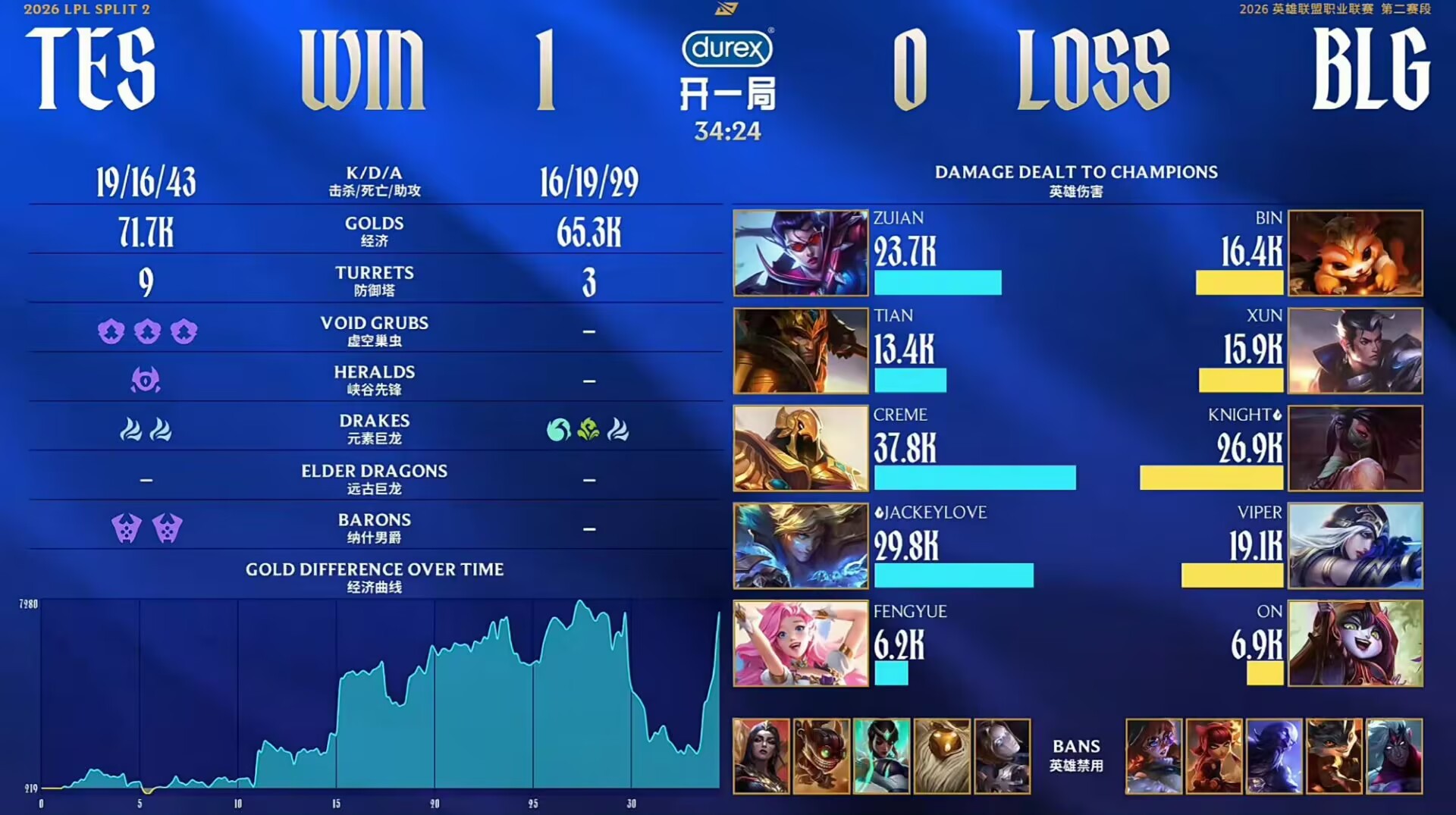4月16日,LPL第二赛段,TES 2-0战胜BLG,送后者第二赛段首败。