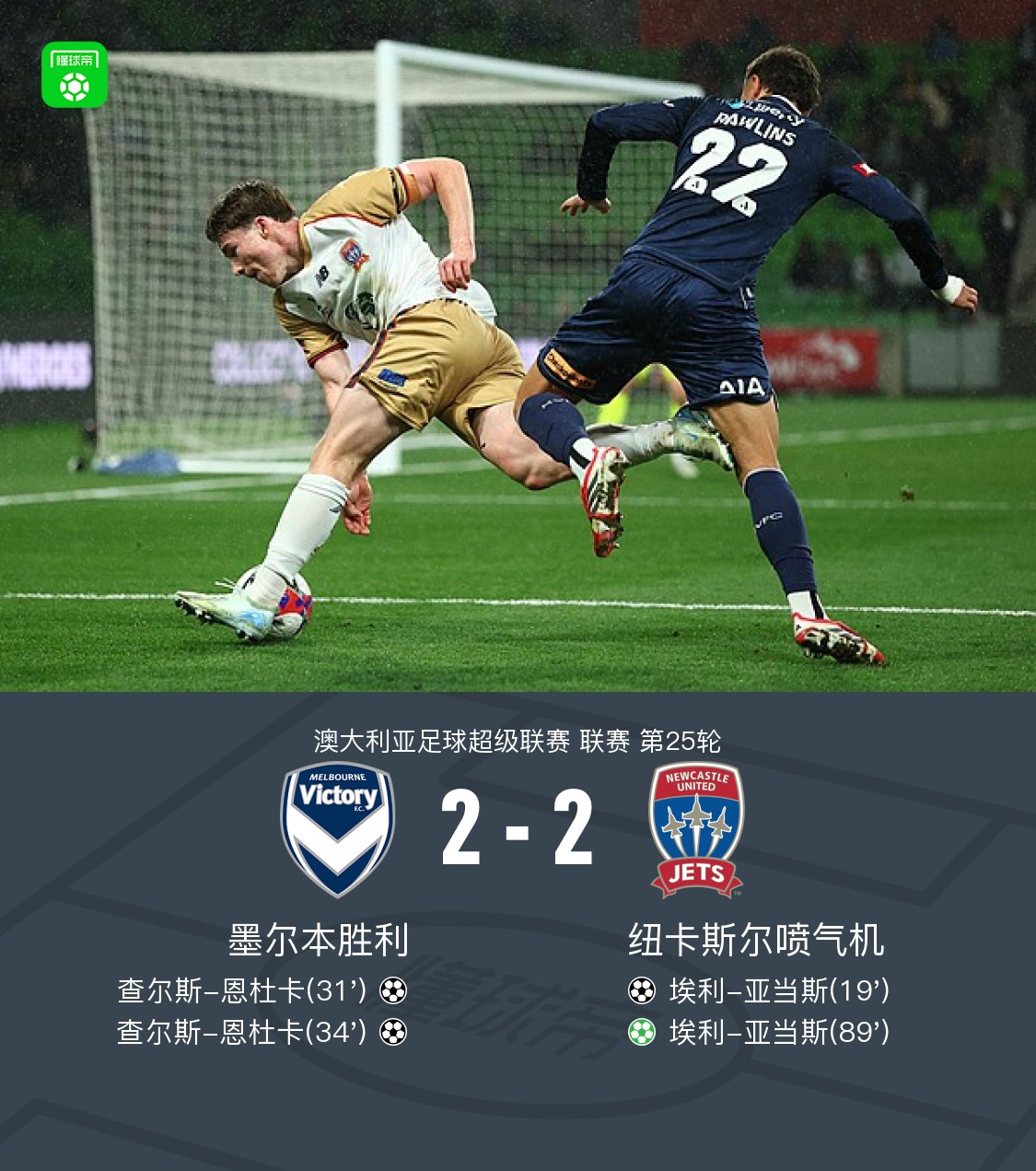 第31分钟,罗林斯助攻查尔斯-恩杜卡破门,墨尔本胜利1-1纽卡斯尔喷气机