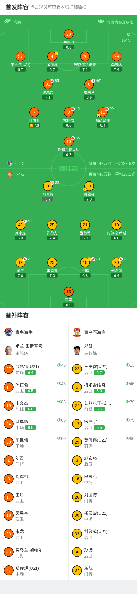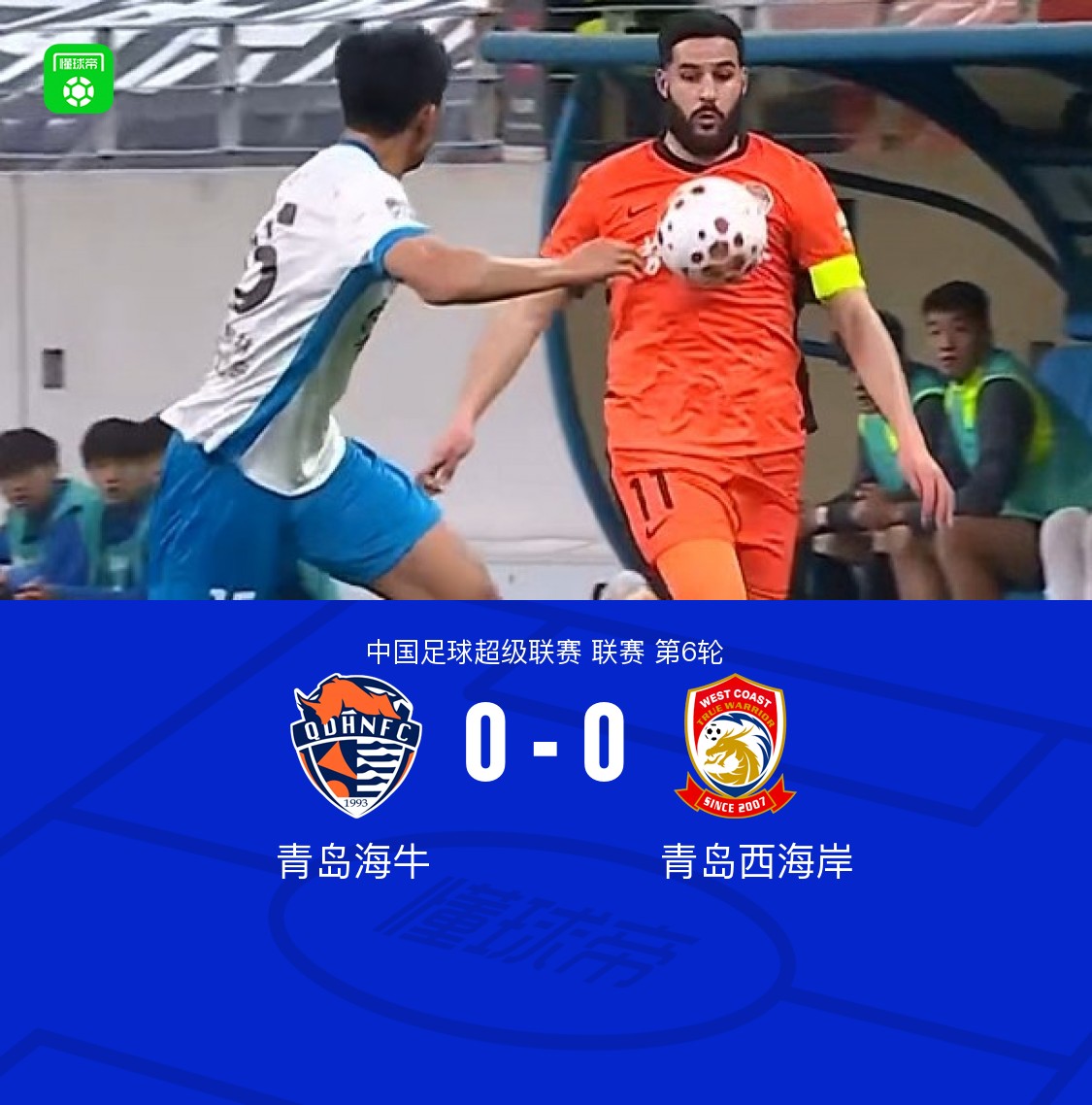 北京时间4月17日中国足球超级联赛 联赛 第6轮,青岛海牛主场对阵青岛西海岸。最终比分青岛海牛 0–0 青岛西海岸。