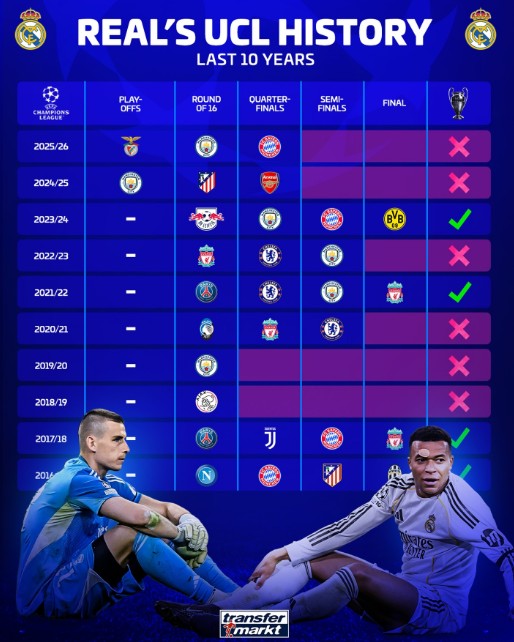 据统计,皇马在过去10个赛季里曾4次夺得欧冠冠军,止步四强、八强、十六强各两次。