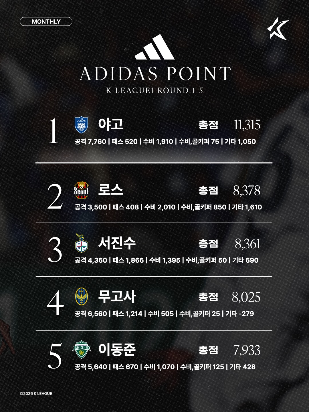 排名第三的是大田韩亚市民前锋徐进水,第四名是被仁川球迷称为“蓝黑终结者”的黑山射手穆戈萨,第五名是全北现代边路快马李洞俊。