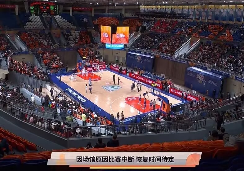 转播方也给出了比赛中断的信号,比赛目前已经暂停了25分钟左右,还没有恢复。比赛暂停时,新疆暂时30-36落后。
