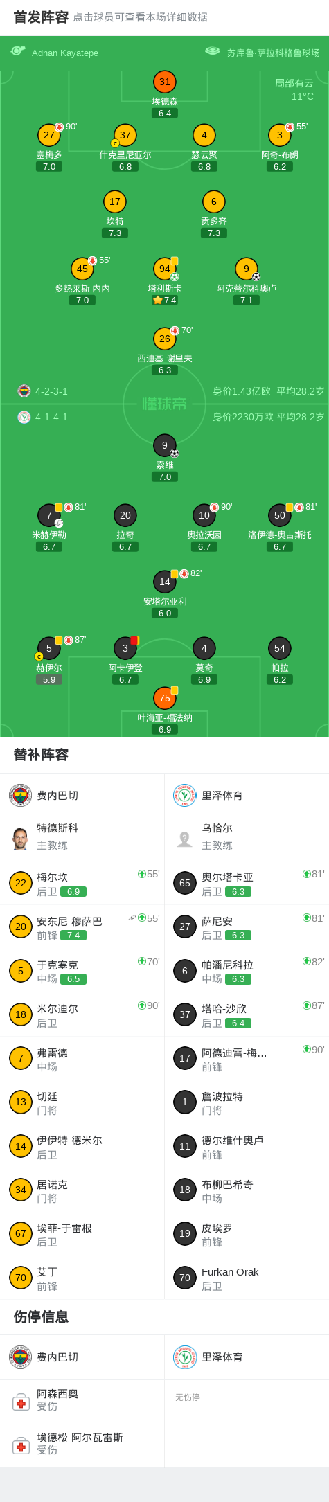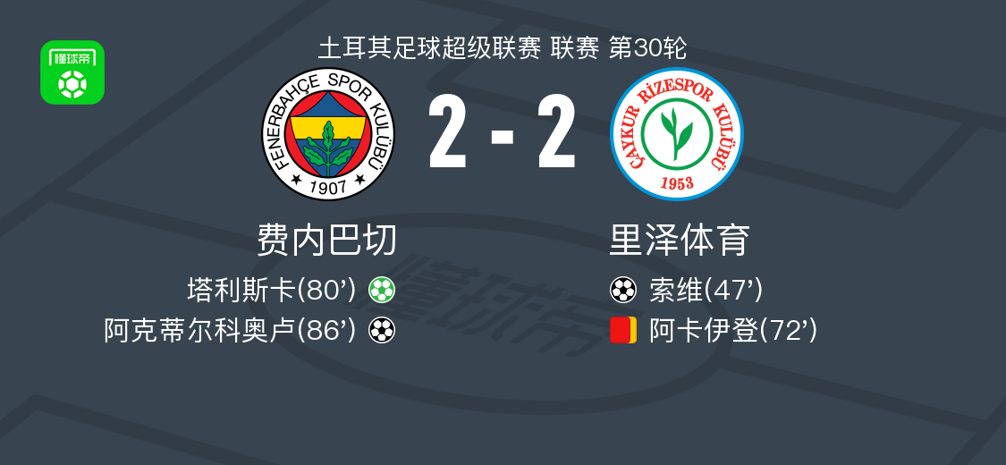 北京时间4月18日土耳其足球超级联赛 联赛 第30轮,费内巴切主场对阵里泽体育。费内巴切塔利斯卡破门,阿克蒂尔科奥卢破门。里泽体育索维破门。最终比分费内巴切 2–2 里泽体育。