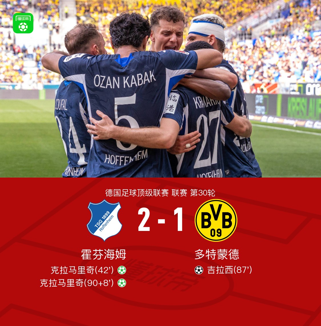 北京时间4月18日德国足球顶级联赛 联赛 第30轮,霍芬海姆主场对阵多特蒙德。霍芬海姆克拉马里奇梅开二度。多特蒙德吉拉西破门。最终比分霍芬海姆 2–1 多特蒙德。