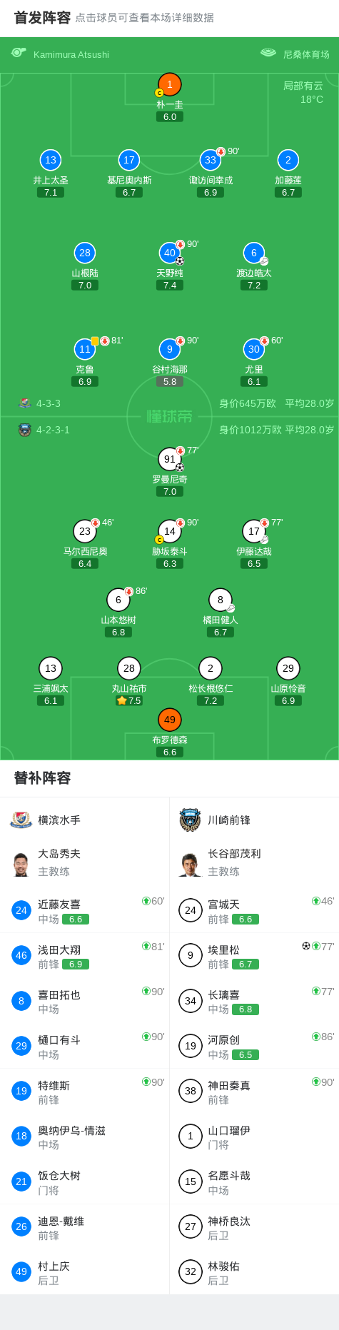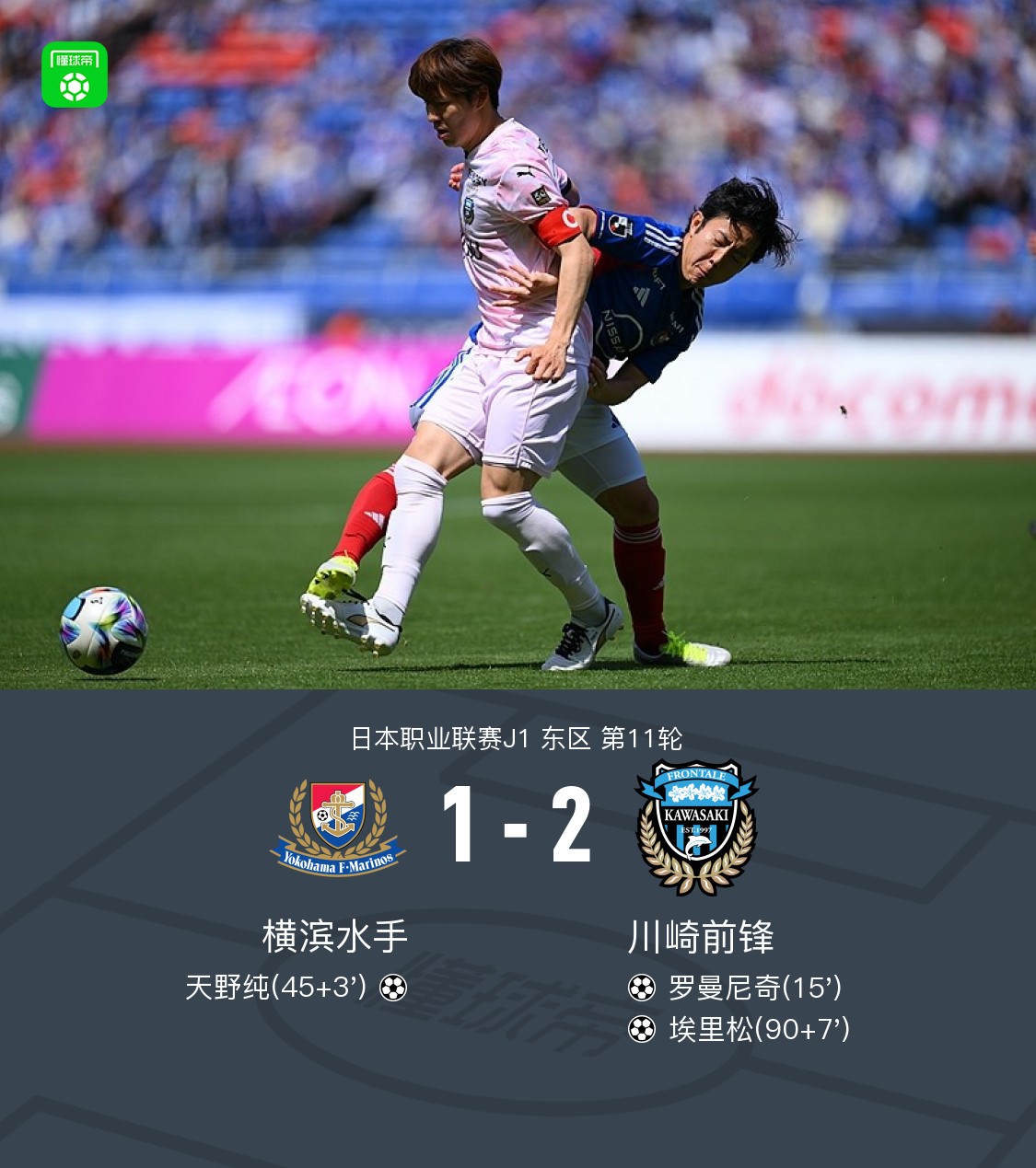 北京时间4月18日日本职业联赛J1东区第11轮,横滨水手主场对阵川崎前锋。横滨水手天野纯破门。川崎前锋罗曼尼奇破门,埃里松打出绝杀。最终比分横滨水手1–2川崎前锋。