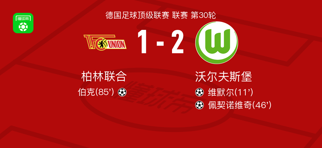 北京时间4月18日德国足球顶级联赛 联赛 第30轮,柏林联合主场对阵沃尔夫斯堡。柏林联合伯克破门。沃尔夫斯堡维默尔破门,佩契诺维奇破门。最终比分柏林联合 1–2 沃尔夫斯堡。