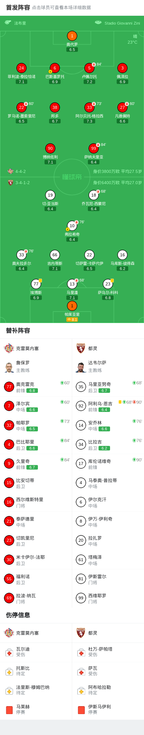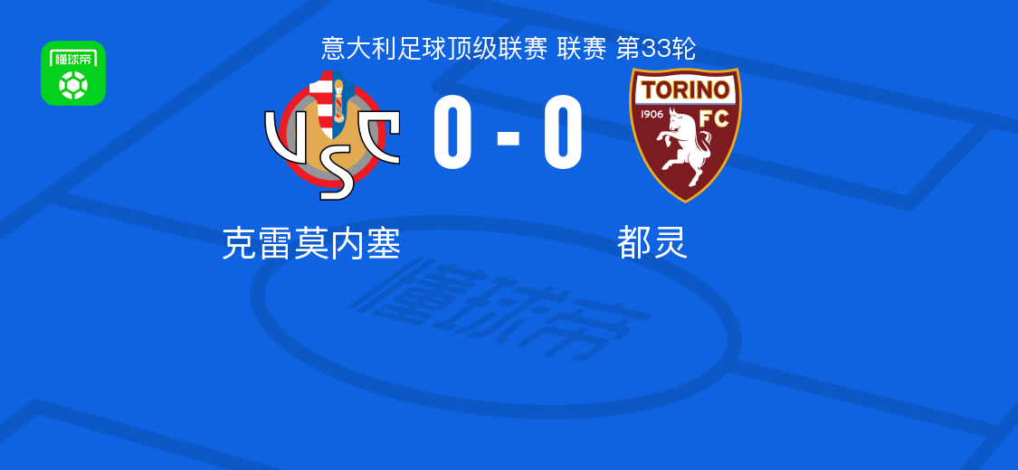 北京时间4月19日,意大利足球顶级联赛第33轮展开角逐,克雷莫内塞坐镇主场迎来都灵的挑战。全场比赛结束,双方均未能攻破对方球门,最终比分定格为克雷莫内塞0-0都灵。 点击查看本场比赛详细数据>> 点击查看意甲完整积分榜>> 球队阵容 技术统计 文章导航 米体:国米想签下帕莱斯特拉,但亚特兰大不会轻易放人 佩蒂特:我一直希望谢尔基能加盟阿森纳,上赛季反复说了很久