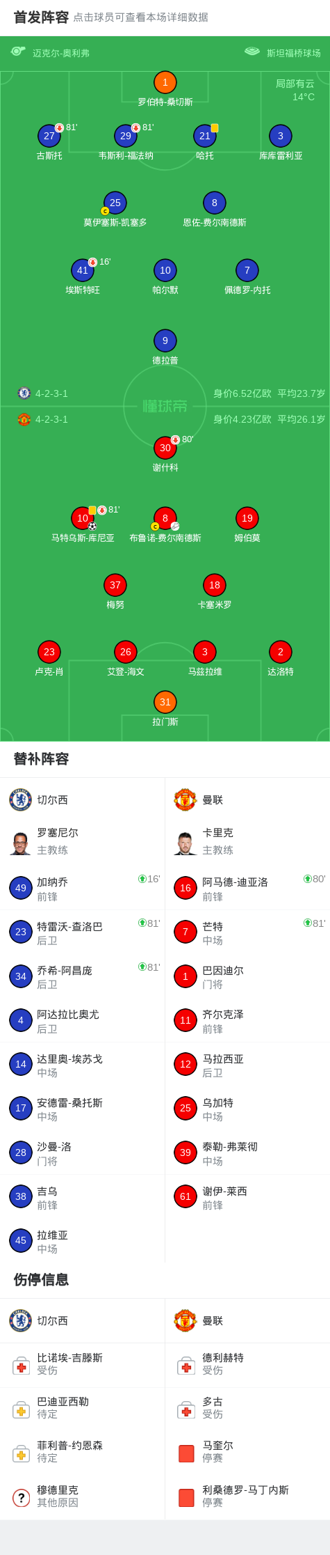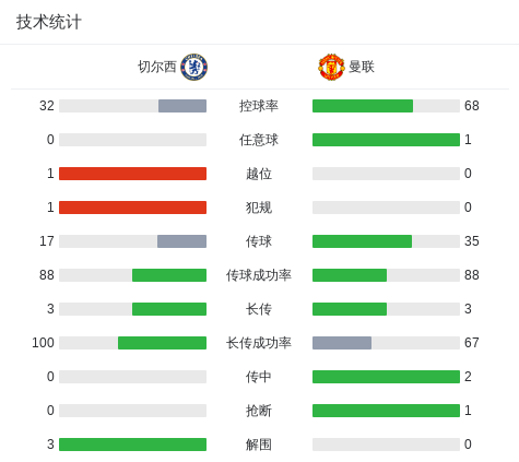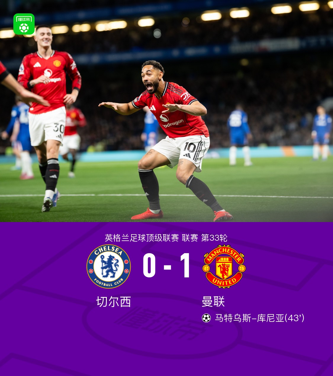 北京时间4月19日英格兰足球顶级联赛 联赛 第33轮,切尔西主场对阵曼联。曼联马特乌斯-库尼亚破门。最终比分切尔西 0–1 曼联。