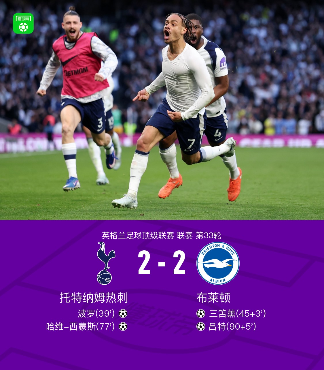 北京时间4月19日英格兰足球顶级联赛 联赛 第33轮,托特纳姆热刺主场对阵布莱顿。托特纳姆热刺波罗破门,哈维-西蒙斯破门。布莱顿三笘薰破门,吕特破门。最终比分热刺 2–2 布莱顿。