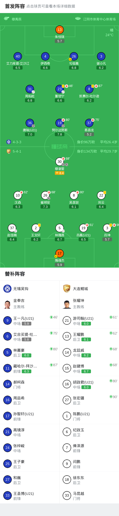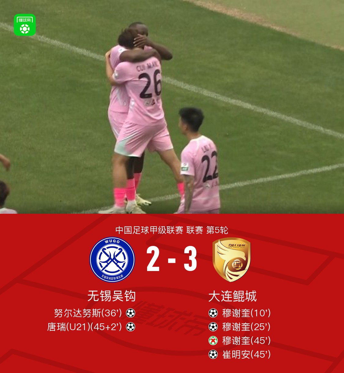北京时间4月19日中国足球甲级联赛 联赛 第5轮,无锡吴钩主场对阵大连鲲城。无锡吴钩努尔达努斯破门,唐瑞破门。大连鲲城穆谢奎梅开二度,崔明安破门。最终比分无锡吴钩 2–3 大连鲲城。