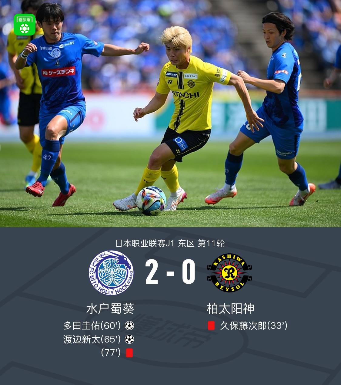 北京时间4月19日日本职业联赛J1 东区 第11轮,水户蜀葵主场对阵柏太阳神。水户蜀葵多田圭佑破门,渡边新太破门。最终比分水户蜀葵 2–0 柏太阳神。