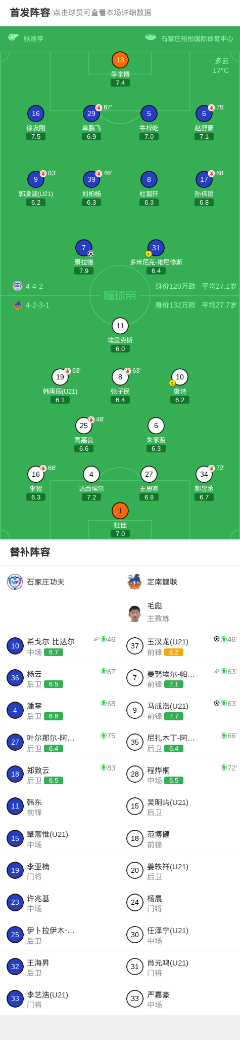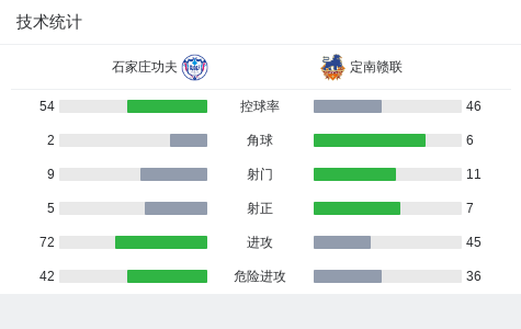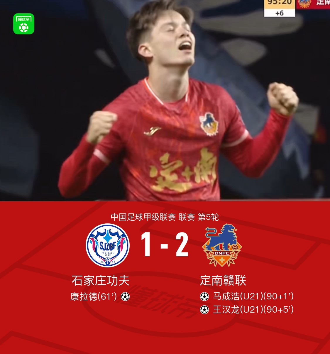 北京时间4月19日中国足球甲级联赛 联赛 第5轮,石家庄功夫主场对阵定南赣联。石家庄功夫康拉德破门。定南赣联马成浩破门,王汉龙破门。最终比分石家庄功夫 12 定南赣联。