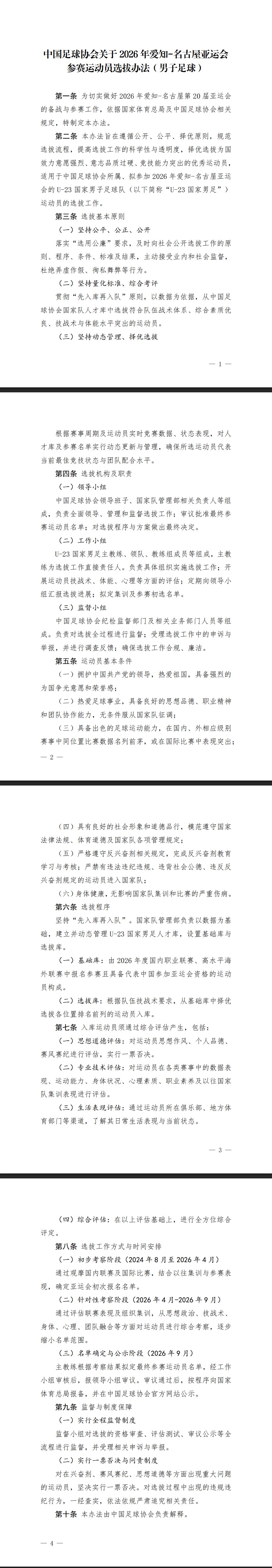 据报道,4月20日,中国足协通过官方渠道公示了《2026年爱知-名古屋亚运会参赛运动员选拔办法(男子足球)》。上面显示,选拔工作初步考察阶段自2024年8月开始至本月完成,意味着目前中国足协与U23国足教练组已通过前期观摩国内联赛及国际比赛,结合球员在以往本队集训与比赛中的表现,确定亚运会初次报名名单。对候选球员针对性考察阶段将从本月开始至今年9月亚运会开赛前完成。根据这套“办法”,选拔工作组将对在兴奋剂、赛风赛纪、思想道德等方面出现重大问题的运动员,坚决实行一票否决。