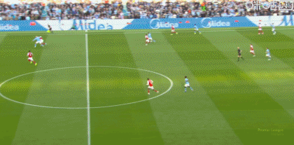 当时哈兰德追一记传到右路的长传,立刻和巴西后卫加布里埃尔缠在一起。