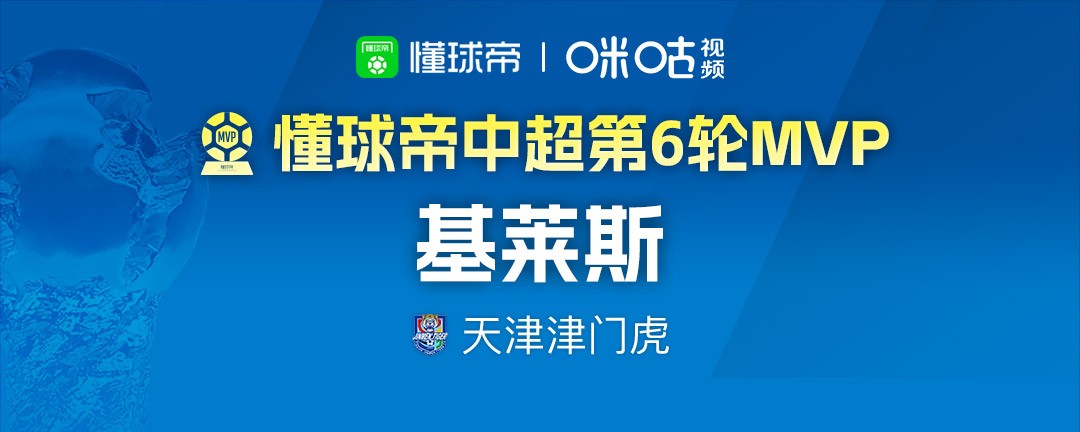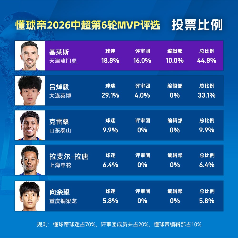 大家好,欢迎来到懂球帝2026赛季中超MVP的评选现场。天津津门虎前锋基莱斯凭借与玉昆一役中两射一传的出色表现,以44.8%的得票率力压吕焯毅,成功当选!