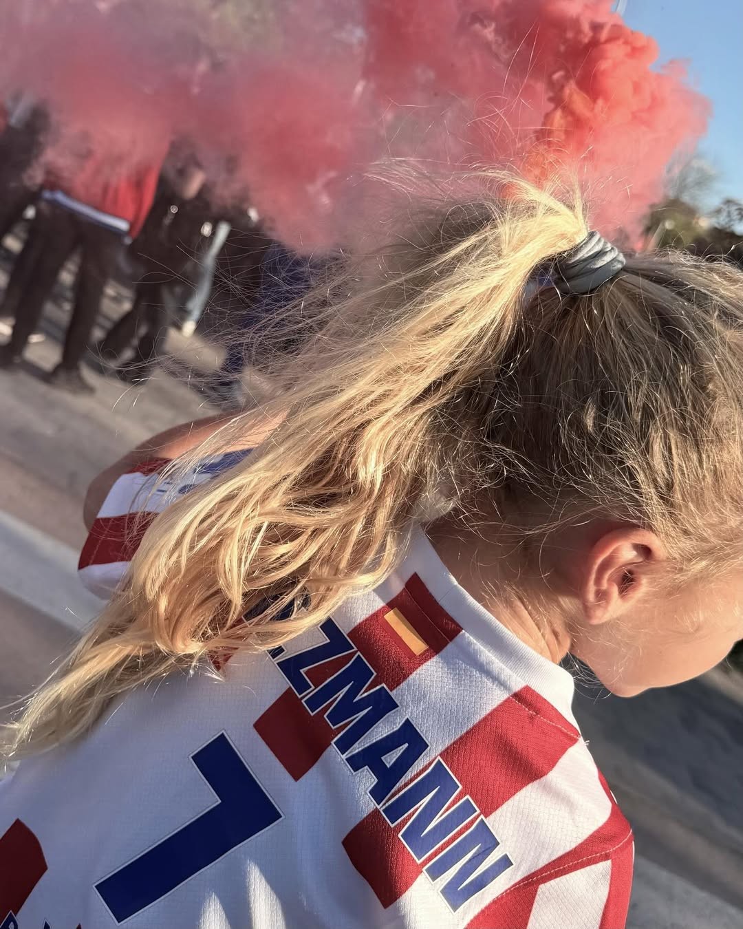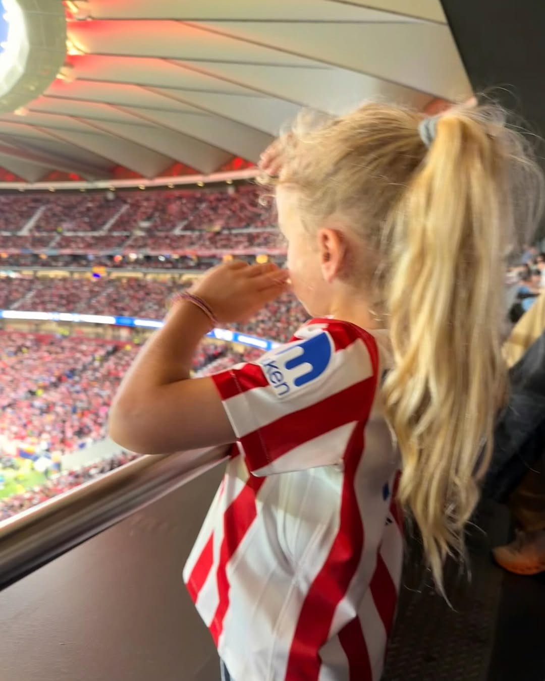 4月18日,格列兹曼的妻子艾丽卡-乔佩雷纳在社交媒体上晒出了自己带女儿观看比赛的照片。