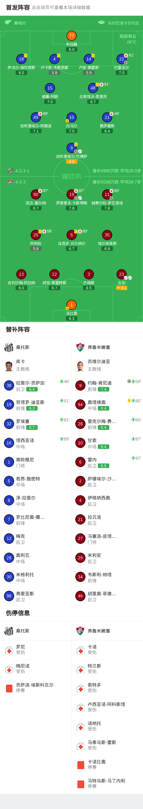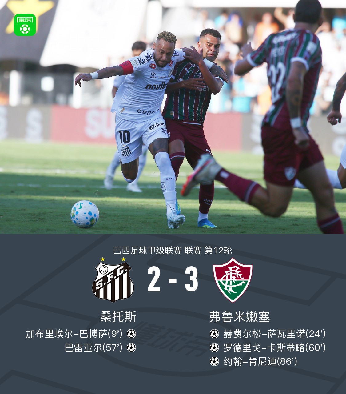 北京时间4月20日巴西足球甲级联赛 联赛 第12轮,桑托斯主场对阵弗鲁米嫩塞。桑托斯加布里埃尔-巴博萨破门,巴雷亚尔破门。弗鲁米嫩塞赫费尔松-萨瓦里诺破门,罗德里戈-卡斯蒂略破门,约翰-肯尼迪破门。最终比分桑托斯 2–3 弗鲁米嫩塞。