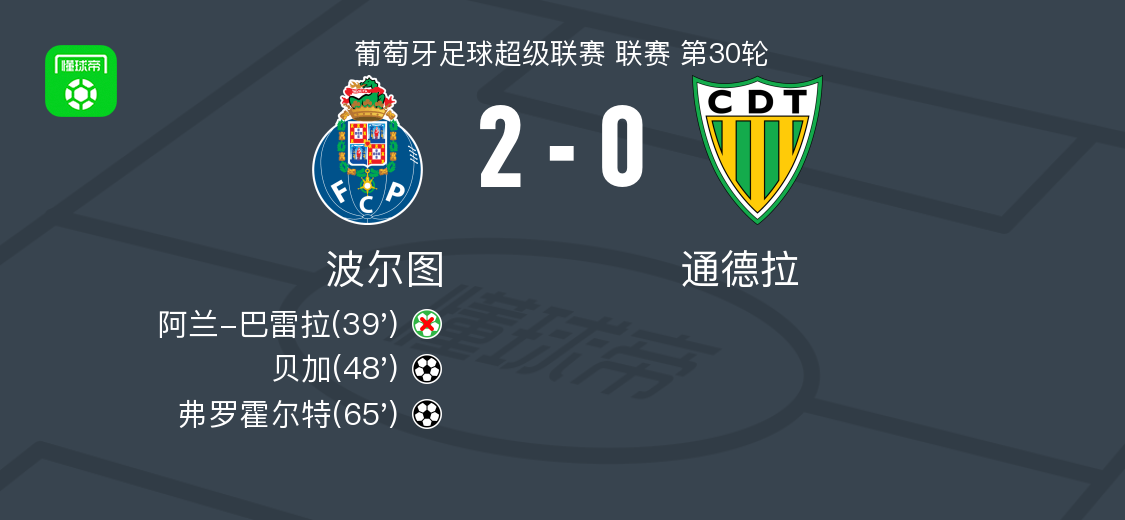 北京时间4月20日葡萄牙足球超级联赛 联赛 第30轮,波尔图主场对阵通德拉。波尔图贝加破门,弗罗霍尔特破门。最终比分波尔图 2–0 通德拉。