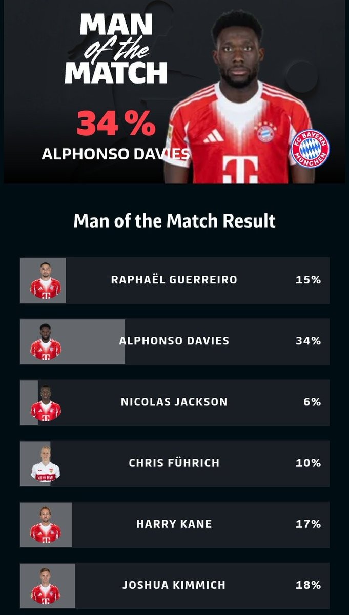 北京时间4月20日,在德甲30轮的比赛中,拜仁慕尼黑主场4-2逆转战胜斯图加特,提前4轮卫冕德甲冠军,赛后此战打进一球的阿方索-戴维斯当选了德甲官方此战的最佳球员。