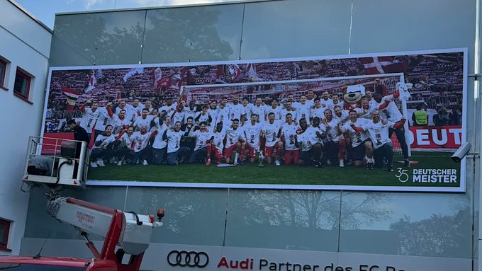 据报道,塞本纳大街训练基地外如今挂着一张巨大的夺冠庆祝照片,拜仁合作伙伴奥迪的大幅广告已被移除,取而代之的是这张崭新的庆祝照片。