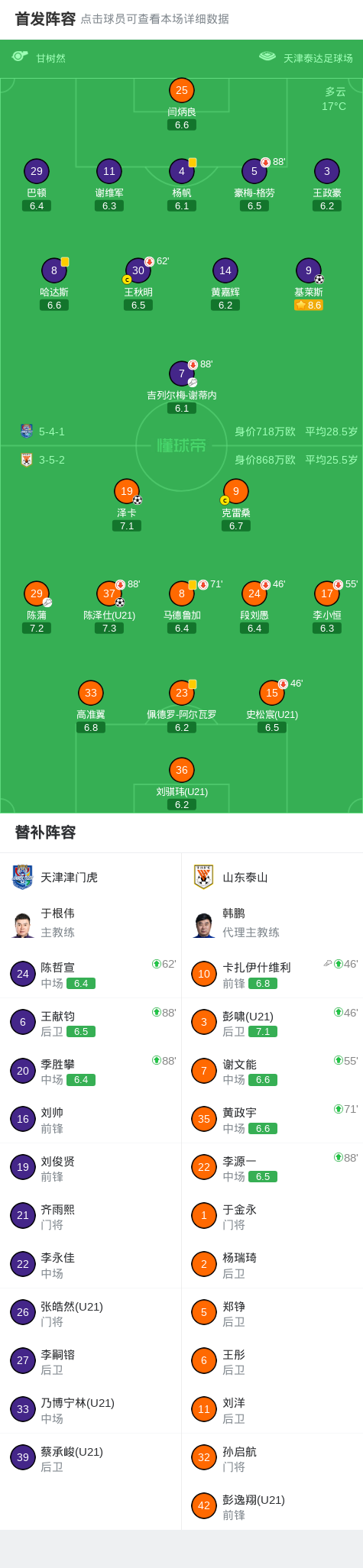 北京时间4月21日中国足球超级联赛第7轮,天津津门虎主场对阵山东泰山。基莱斯破门,谢蒂内助攻+丢点。泽卡破门+中框,陈泽仕建功。最终比分天津津门虎1–2山东泰山。