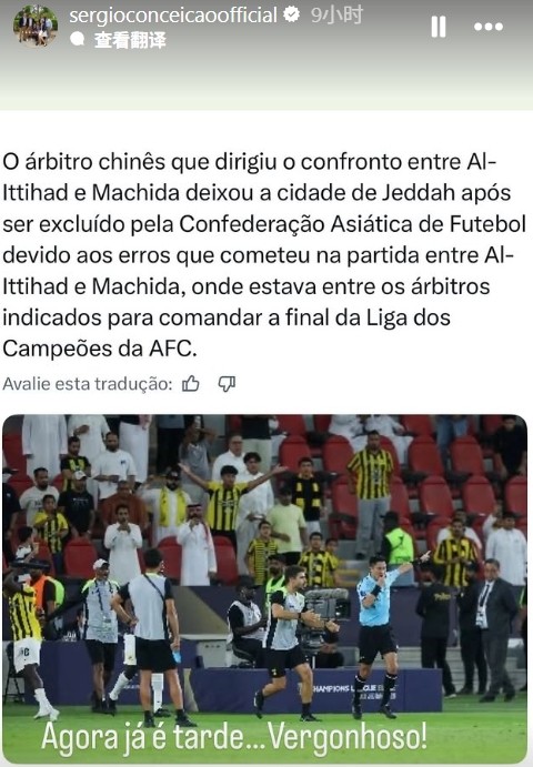 北京时间4月21日,据沙特媒体报道,马宁因在亚冠四分之一决赛中的失误,被取消亚冠执法资格。吉达联合主教练孔塞桑随后转发了这篇报道,并评论:太迟了,真是丢人。