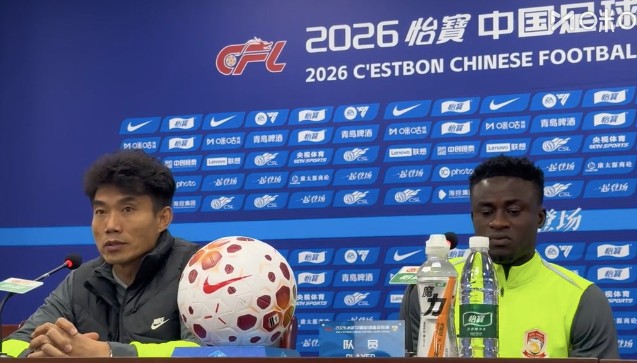 4月21日,中超联赛,青岛西海岸主帅郑智和球员阿齐兹出席了对阵河南队的赛前新闻发布会。