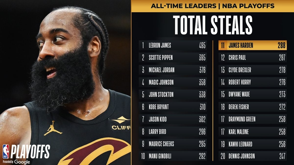 此外,哈登还达成了另一项成就——季后赛生涯抢断数超越保罗升至NBA历史第11位!此役他送出了5次抢断。