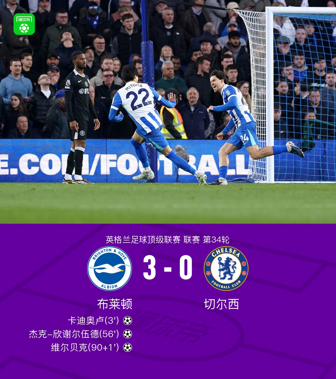 北京时间4月22日3:00,英超第34轮,切尔西客场挑战布莱顿。上半场,卡迪奥卢闪击破门,范赫克头球攻门被扑,桑切斯失误险送礼,查洛巴门线救险。下半场,拉维亚远射打高,吕特助攻欣谢尔伍德扩大比分,维尔贝克替补建功,最终,切尔西0-3客负布莱顿遭联赛5连败且1球未进,近8场各项赛事1胜7负。