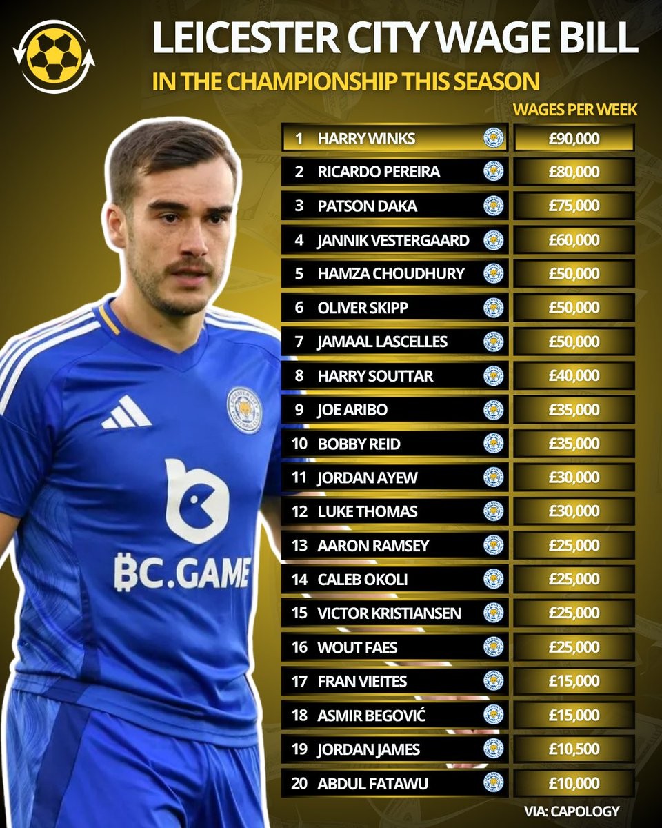 北京时间4月23日,在莱斯特城提前降入英甲的情况下,Capology统计出了蓝狐本赛季队内20名球员的周薪,温克斯9万英镑最高,20人合计周薪超过了77万英镑。